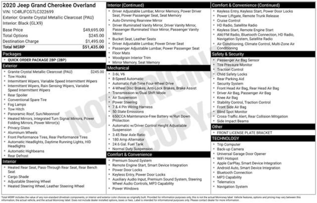 Take your drives to the next level with this Jeep Grand Cherokee from Salt Lake Valley Buick GMC! Engineered for a smooth ride, advanced convenience, and lasting dependability, this vehicle is ready to handle everything your day throws at you. Plus, enjoy a $1,000 finance savings, already included in the sale price, when you finance through one of our trusted lending partners. Looking for quality used cars in Salt Lake City? This Jeep Grand Cherokee delivers style, versatility, and value - perfect for daily commutes, family trips, or weekend adventures. Stop by Salt Lake Valley Buick GMC to see this vehicle in person and explore our wide selection of pre-owned cars, trucks, and SUVs. Browse online at www.slvbuickgmc.com or call 801-265-1511 to schedule your test drive today! With Quick Order Package 2BP, 1-Year SiriusXM Guardian Trial, 10 Speakers, 3.45 Rear Axle Ratio, 4-Wheel Disc Brakes, 4G LTE Wi-Fi Hot Spot, 7 & 4 Pin Wiring Harness, 8.4 Touchscreen Display, ABS brakes, Active Noise Control System, Air Conditioning, Alloy wheels, AM/FM radio: SiriusXM, Anti-whiplash front head restraints, Apple CarPlay, Apple CarPlay/Android Auto, Audio memory, Auto High-beam Headlights, Auto-dimming door mirrors, Auto-dimming Rear-View mirror, Auto-leveling suspension, Automatic temperature control, Brake assist, Bumpers: body-color, Class IV Receiver Hitch, Compass, Delay-off headlights, Driver door bin, Driver vanity mirror, Dual Bright Exhaust Tips, Dual front impact airbags, Dual front side impact airbags, Electronic Stability Control, Emergency communication system: SiriusXM Guardian, Engine Oil Cooler, Four wheel independent suspension, Front anti-roll bar, Front Bucket Seats, Front Center Armrest w/Storage, Front dual zone A/C, Front fog lights, Front License Plate Bracket, Front reading lights, Fully automatic headlights, Garage door transmitter, Genuine wood dashboard insert, Google Android Auto, GPS Antenna Input, GPS Navigation, HD Radio, Heated door mirrors, Heated front seats, Heated rear seats, Heated steering wheel, Heavy-Duty Engine Cooling, High intensity discharge headlights: Bi-Xenon, Illuminated entry, Integrated Center Stack Radio, Integrated Voice Command w/Bluetooth, Knee airbag, Leather Shift Knob, Leather steering wheel, Leather Trim Seats w/Edge Welting, Low tire pressure warning, Manufacturer's Statement of Origin (DISC), Memory seat, Navigation System, Normal Duty Suspension, Occupant sensing airbag, Outside temperature display, Overhead airbag, Overhead console, Panic alarm, ParkView Rear Back-Up Camera, Passenger door bin, Passenger vanity mirror, Power door mirrors, Power driver seat, Power Liftgate, Power moonroof, Power passenger seat, Power steering, Power windows, Radio data system, Radio: Uconnect 4C Nav w/8.4 Display, Rain sensing wipers, Rain Sensitive Windshield Wipers, Rear anti-roll bar, Rear reading lights, Rear seat center armrest, Rear window defroster, Rear window wiper, Remote keyless entry, Security system, SiriusXM Satellite Radio, SiriusXM Traffic Plus, SiriusXM Travel Link, Speed control, Speed-sensing steering, Speed-Sensitive Wipers, Split folding rear seat, Spoiler, Steering wheel mounted audio controls, Tachometer, Telescoping steering wheel, Tilt steering wheel, Traction control, Trip computer, Turn signal indicator mirrors, USB Host Flip, Variably intermittent wipers, Ventilated front seats, Voltmeter, and Wheels: 20 x 8.0 Polished/Tech Gray Aluminum designed for convenience and enjoyment, this Jeep Grand Cherokee is ready to take you wherever you want to go.Clean CARFAX.
