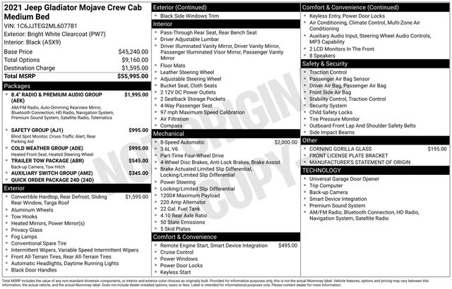 Get ready to hit the road in this Jeep Gladiator, a standout choice for drivers looking for reliability, performance, and style! This impressive vehicle is packed with premium features designed to make every drive more enjoyable. Plus, youâll enjoy a $1,000 finance savings, already included in the sale price, when you finance through one of our trusted lending partners. Whether youâre searching for used cars in Salt Lake City, a dependable SUV, or a powerful truck, this Jeep Gladiator delivers everything you need and more. Visit Salt Lake Valley Chrysler Dodge Jeep Ram today to test drive or explore our entire selection of quality pre-owned vehicles. Donât wait - shop online at www.slvcdjr.com or call 801-484-8755 to learn more! This amazing vehicle comes loaded with options like 8.4" Radio & Premium Audio Group (1-Year SiriusXM Guardian Trial, 5-Year SiriusXM Traffic Service, 5-Year SiriusXM Travel Link Service, 8.4" Touchscreen Display, Alpine Premium Audio System, Auto-Dimming Rear-View Mirror, Emergency/Assistance Call, For Details, Visit DriveUconnect.com, GPS Navigation, HD Radio, Radio: Uconnect 4C Nav w/8.4" Display, SiriusXM Traffic Plus, and SiriusXM Travel Link), Auxiliary Switch Group (240 Amp Alternator, 700 Amp Maintenance Free Battery, and Auxiliary Switches), Cold Weather Group (Heated Front Seats and Heated Steering Wheel), Quick Order Package 24D, Safety Group (Blind Spot & Cross Path Detection and ParkSense Rear Park Assist System), Trailer Tow Package (Class IV Hitch Receiver, Heavy-Duty Engine Cooling, and Trailer Hitch Zoom), 4-Wheel Disc Brakes, 4.10 Rear Axle Ratio, 8 Speakers, 97 mph Maximum Speed Calibration, ABS brakes, Air Conditioning, Alloy wheels, AM/FM radio: SiriusXM, Apple CarPlay/Android Auto, Automatic temperature control, Black 3-Piece Hard Top, Brake assist, Compass, Corning Gorilla Glass, Delay-off headlights, Driver door bin, Driver vanity mirror, Dual front impact airbags, Dual front side impact airbags, Electronic Stability Control, Freedom Panel Storage Bag, Front anti-roll bar, Front Bucket Seats, Front Center Armrest w/Storage, Front dual zone A/C, Front fog lights, Front License Plate Bracket, Front reading lights, Fully automatic headlights, Garage door transmitter, Heated door mirrors, Heavy Duty Suspension w/Gas Shocks, Illuminated entry, Integrated roll-over protection, Leather steering wheel, Low tire pressure warning, Manufacturer's Statement of Origin, Occupant sensing airbag, Outside temperature display, Panic alarm, ParkView Rear Back-Up Camera, Passenger door bin, Passenger vanity mirror, Power door mirrors, Power steering, Power windows, Premium Cloth Seats w/Sport Bolsters, Radio data system, Radio: Uconnect 4 w/7" Display, Rear anti-roll bar, Rear reading lights, Rear Sliding Window, Rear Window Defroster, Remote keyless entry, Remote Start System, Security system, Speed control, Split folding rear seat, Steering wheel mounted audio controls, Tachometer, Telescoping steering wheel, Tilt steering wheel, Traction control, Trip computer, Variably intermittent wipers, Voltmeter, and Wheels: 17" x 7.5" Low Gloss Black Aluminum, making it the perfect choice for your next adventure. Priced below KBB Fair Purchase Price!