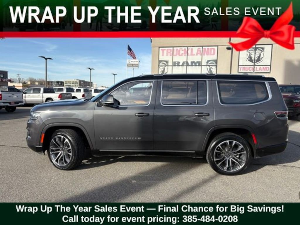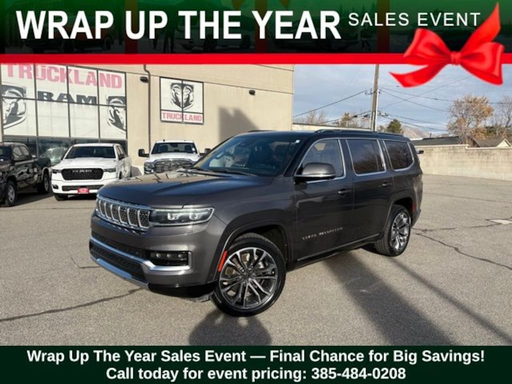 Get ready to hit the road in this Jeep Grand Wagoneer, a standout choice for drivers looking for reliability, performance, and style! This impressive vehicle is packed with premium features designed to make every drive more enjoyable. Plus, youâll enjoy a $1,000 finance savings, already included in the sale price, when you finance through one of our trusted lending partners. Whether youâre searching for used cars in Salt Lake City, a dependable SUV, or a powerful truck, this Jeep Grand Wagoneer delivers everything you need and more. Visit Salt Lake Valley Chrysler Dodge Jeep Ram today to test drive or explore our entire selection of quality pre-owned vehicles. Donât wait - shop online at www.slvcdjr.com or call 801-484-8755 to learn more! This amazing vehicle comes loaded with options like Quick Order Package 23W, Two Tone Paint Group, 3.92 Rear Axle Ratio, 3rd row seats: bench, 4-Wheel Disc Brakes, ABS brakes, Adjustable pedals, Air Conditioning, Alloy wheels, AM/FM radio: SiriusXM with 360L, Anti-whiplash front head restraints, Audio memory, Auto High-beam Headlights, Auto-dimming door mirrors, Auto-dimming Rear-View mirror, Auto-leveling suspension, Automatic temperature control, Brake assist, Bumpers: body-color, Compass, Delay-off headlights, Driver door bin, Driver vanity mirror, Driver's Seat Mounted Armrest, Dual front impact airbags, Dual front side impact airbags, Electronic Stability Control, Four wheel independent suspension, Front anti-roll bar, Front Bucket Seats, Front Center Armrest w/Storage, Front dual zone A/C, Front fog lights, Front reading lights, Fully automatic headlights, Garage door transmitter, Genuine wood console insert, Genuine wood dashboard insert, Genuine wood door panel insert, Heads-Up Display, Heated door mirrors, Heated front seats, Heated rear seats, Heated steering wheel, Illuminated entry, Knee airbag, Leather steering wheel, Low tire pressure warning, Memory seat, Navigation System, Night vision lights, Normal Duty Suspension, Occupant sensing airbag, Outside temperature display, Overhead airbag, Overhead console, Panic alarm, Passenger door bin, Passenger seat mounted armrest, Passenger vanity mirror, Pedal memory, Power adjustable front head restraints, Power door mirrors, Power driver seat, Power Liftgate, Power moonroof, Power passenger seat, Power steering, Power windows, Premium Leather Trimmed Bucket Seats, Radio data system, Radio: Uconnect 5 Nav w/12.0" Display, Rain sensing wipers, Rear air conditioning, Rear anti-roll bar, Rear dual zone A/C, Rear reading lights, Rear seat center armrest, Rear window defroster, Rear window wiper, Reclining 3rd row seat, Remote keyless entry, Roof rack, Security system, Speed control, Speed-sensing steering, Speed-Sensitive Wipers, Split folding rear seat, Steering wheel memory, Steering wheel mounted audio controls, Tachometer, Telescoping steering wheel, Tilt steering wheel, Traction control, Trip computer, Turn signal indicator mirrors, Variably intermittent wipers, Ventilated front seats, Ventilated rear seats, Voltmeter, Wheels: 22" x 9.0" Painted Aluminum, and Wheels: 22" x 9.0" Premium 4 Aluminum, making it the perfect choice for your next adventure. Priced below KBB Fair Purchase Price!