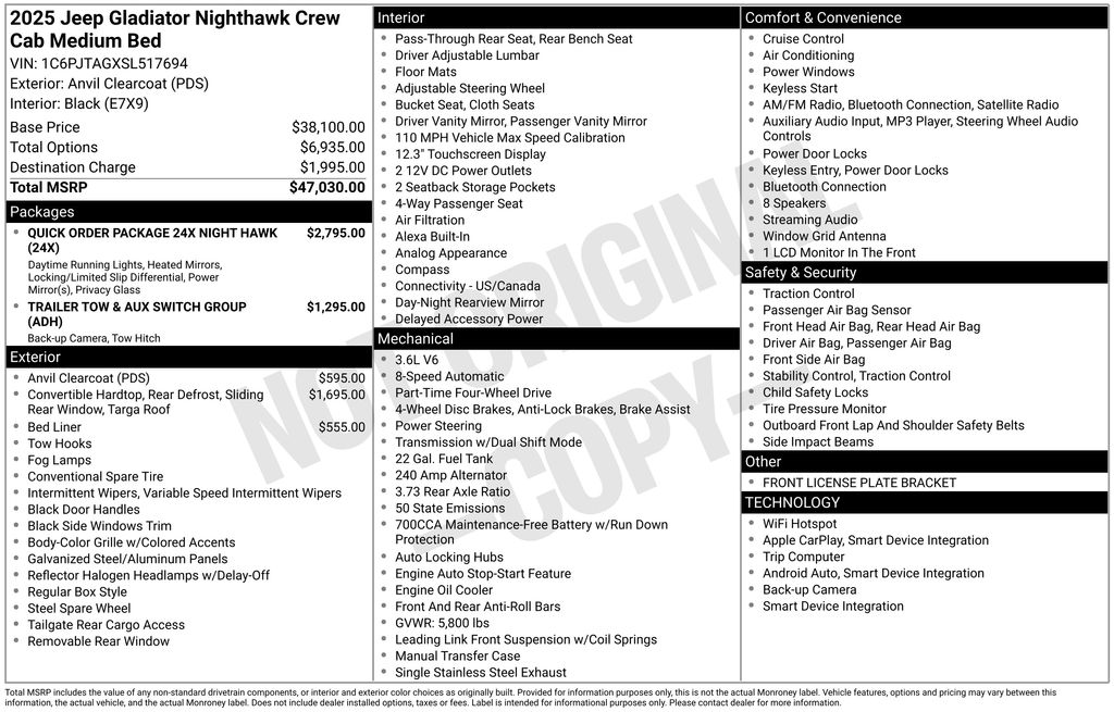 Anvil Clearcoat 2025 Jeep Gladiator Nighthawk 4WD 8-Speed Automatic 3.6L V6 24V VVT