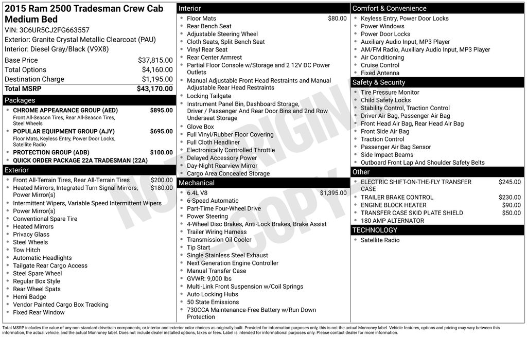 Check out our award winning dealership! 5-star google review, drive a little save a lot. Chrome Appearance Group (Bright Front Bumper, Bright Grille, Bright Rear Bumper, and Wheels: 18" x 8.0" Steel Chrome Clad), Popular Equipment Group (1-Yr SiriusXM Radio Service, 40/20/40 Split Bench Seat, Carpet Floor Covering, Cloth 40/20/40 Bench Seat, For More Info, Call 800-643-2112, Front & Rear Floor Mats, Rear Folding Seat, Remote Keyless Entry, and SiriusXM Satellite Radio), Protection Group, Quick Order Package 22A Tradesman (Front Armrest w/Cupholders), 17" x 7.5" Steel Styled Wheels, 180 Amp Alternator, 3.73 Rear Axle Ratio, 4-Wheel Disc Brakes, 6 Speakers, ABS brakes, Air Conditioning, AM/FM radio, Black Exterior Mirrors, Brake assist, Center Hub, Continental Radio Manufacturer, Delay-off headlights, Driver door bin, Dual front impact airbags, Dual front side impact airbags, Electric Shift-On-The-Fly Transfer Case, Electronic Stability Control, Electronically Controlled Throttle, Engine Block Heater, Exterior Mirrors Courtesy Lamps, Exterior Mirrors w/Heating Element, Exterior Mirrors w/Supplemental Signals, Front & Rear Rubber Floor Mats, Front anti-roll bar, Front Bumper Sight Shields, Front Center Armrest, Fully automatic headlights, Heated door mirrors, Heavy Duty Vinyl 40/20/40 Split Bench Seat, Hemi Badge, Locking Tailgate, Low tire pressure warning, Media Hub (USB, AUX), Next Generation Engine Controller, Occupant sensing airbag, Overhead airbag, Passenger door bin, Power Black Trailer Tow Mirrors, Power door mirrors, Power steering, Power windows, Radio data system, Radio: Uconnect 3.0 AM/FM, Rear seat center armrest, Rear step bumper, Rear Wheel Spats, Speed control, Storage Tray, Tachometer, Tilt steering wheel, Tip Start, Traction control, Trailer Brake Control, Trailer Tow Mirrors, Transmission Oil Cooler, Variably intermittent wipers, Vendor Painted Cargo Box Tracking, and Voltmeter Sale Price Includes $1,000 Finance Savings. Contact Dealer For Details.