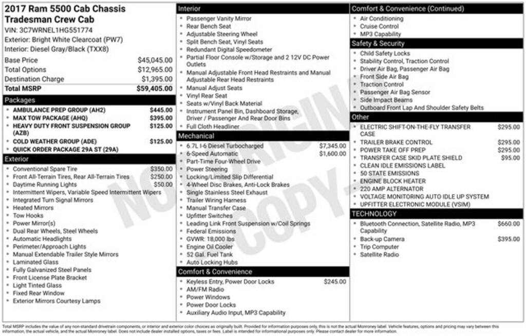 Get ready to hit the road in this Ram 5500HD, a standout choice for drivers looking for reliability, performance, and style! This impressive vehicle is packed with premium features designed to make every drive more enjoyable. Plus, youâll enjoy a $1,000 finance savings, already included in the sale price, when you finance through one of our trusted lending partners. Whether youâre searching for used cars in Salt Lake City, a dependable SUV, or a powerful truck, this Ram 5500HD delivers everything you need and more. Visit Salt Lake Valley Chrysler Dodge Jeep Ram today to test drive or explore our entire selection of quality pre-owned vehicles. Donât wait - shop online at www.slvcdjr.com or call 801-484-8755 to learn more! This amazing vehicle comes loaded with options like Ambulance Prep Group (Upfitter Electronic Module (VSIM) and Voltage Monitoring Auto Idle Up System), Cold Weather Group (Engine Block Heater and Winter Front Grille Cover), Max Tow Package (4.88 Rear Axle Ratio, Transmission Software Calibration, and Underbody Thermal Protection), Quick Order Package 29A ST (Base Door Trim Panel and Front Armrest w/Cupholders), 1-Yr SiriusXM Radio Service, 19.5" x 6.0" Steel Wheels, 220 Amp Alternator, 4-Wheel Disc Brakes, 40/20/40 Split Bench Seat, 5.0" Touchscreen Display, 6 Speakers, ABS brakes, Air Conditioning, AM/FM radio, Delay-off headlights, Driver door bin, Dual front impact airbags, Dual front side impact airbags, Dual rear wheels, Electric Shift-On-The-Fly Transfer Case, Electronic Stability Control, Exterior Mirrors Courtesy Lamps, Exterior Mirrors w/Heating Element, Exterior Mirrors w/Supplemental Signals, For More Info, Call 800-643-2112, Front anti-roll bar, Front Center Armrest w/Storage, Fully automatic headlights, GPS Antenna Input, HD Vinyl 40/20/40 Split Bench Seat, Heated door mirrors, Heavy Duty Front Suspension Group, Integrated Voice Command w/Bluetooth, Low Beam Daytime Running Headlamps, Manual Adjust Seats, Media Hub (USB, AUX), Occupant sensing airbag, ParkView Rear Back-Up Camera, Passenger door bin, Passenger vanity mirror, Power door mirrors, Power steering, Power windows, Radio data system, Radio: 3.0, Radio: Uconnect 3 w/5" Display, Rear anti-roll bar, Rear Folding Seat, Remote Keyless Entry, SiriusXM Satellite Radio, Speed control, Storage Tray, Tachometer, Tilt steering wheel, Traction control, Trailer Brake Control, Trip computer, Turn signal indicator mirrors, Variably intermittent wipers, and Voltmeter, making it the perfect choice for your next adventure.
