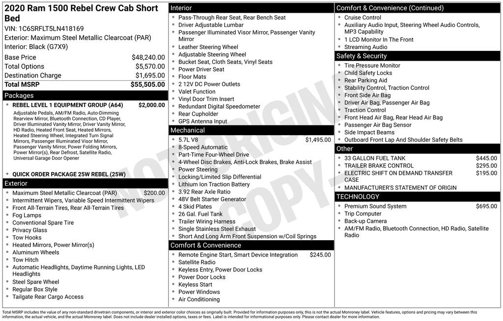 Maximum Steel Metallic Clearcoat 2020 Ram 1500 Rebel 4WD 8-Speed Automatic HEMI 5.7L V8 Multi Displacement VVT