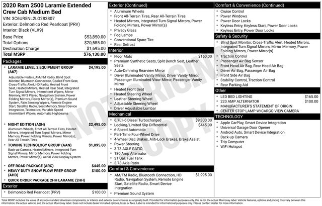 Designed to tackle the toughest jobs, the 2020 Ram 2500 Laramie is equipped with a host of advanced towing and off-road capabilities. The Towing Technology Group includes a surround-view camera system, trailer reverse guidance, and power-folding tow mirrors with memory. The Off Road Package, featuring performance-tuned shock absorbers and hill descent control, ensures you can confidently navigate even the most challenging terrain.