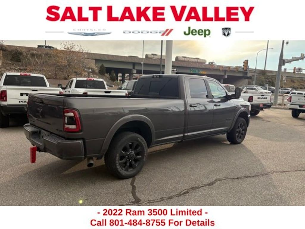 Get ready to hit the road in this Ram 3500, a standout choice for drivers looking for reliability, performance, and style! This impressive vehicle is packed with premium features designed to make every drive more enjoyable. Plus, youâll enjoy a $1,000 finance savings, already included in the sale price, when you finance through one of our trusted lending partners. Whether youâre searching for used cars in Salt Lake City, a dependable SUV, or a powerful truck, this Ram 3500 delivers everything you need and more. Visit Salt Lake Valley Chrysler Dodge Jeep Ram today to test drive or explore our entire selection of quality pre-owned vehicles. Donât wait - shop online at www.slvcdjr.com or call 801-484-8755 to learn more! This amazing vehicle comes loaded with options like Cold Weather Group (Engine Block Heater and MOPAR Winter Front Grille Cover), Limited Level 1 Equipment Group (17 Speaker harman kardon Premium Sound, Adaptive Cruise Control w/Stop, Adaptive Steering System, CTR Stop Lamp w/Cargo View Camera, Digital Rearview Mirror, Full Speed Forward Collision Warning Plus, Lane Keep Assist, Surround View Camera System, and Trailer Reverse Guidance), Night Edition (Black Exterior Mirrors, Black Exterior Truck Badging, Black Grille Limited, Black Headlamp Bezels, Black Ram Head Tailgate Badge, Black Tail Lamp Bezels, Black Wheel Center Hub, Body Color Door Handles, Body Color Grille Surround, Exterior Mirrors Courtesy Lamps, Exterior Mirrors w/Heating Element, Exterior Mirrors w/Memory, Exterior Mirrors w/Supplemental Signals, Mirror Running Lights, Mirror-Mounted Aux Reverse Lamps, Painted Front Bumper, Painted Rear Bumper, Power Adjustable Convex Aux Mirrors, Power Black Tow Mirrors w/Convex Spotter & Memory, Power-Folding Mirrors, Tow Hooks, and Trailer Tow Mirrors), Protection Group, Quick Order Package 21M Limited, 10 Speakers, 12" Touchscreen Display, 220 Amp Alternator, 3.73 Axle Ratio, 4-Wheel Disc Brakes, 4G LTE Wi-Fi Hot Spot, 50 Gallon Fuel Tank, 5th Wheel/Gooseneck Towing Prep Group, ABS brakes, Active Noise Control System, Adjustable pedals, Air Conditioning, Air Suspension Decal, Alloy wheels, AM/FM radio: SiriusXM with 360L, Apple CarPlay, Apple CarPlay/Android Auto, Audio memory, Auto High-beam Headlights, Auto Level Rear Air Suspension, Auto-dimming Rear-View mirror, Automatic temperature control, Bodyside moldings, Brake assist, Bumpers: chrome, Center Hub, Compass, Connected Travel & Traffic Services, Connectivity - US/Canada, Dash Pass Thru Wire Circuits, Delay-off headlights, Delete Spray In Bedliner, Disassociated Touchscreen Display, Driver door bin, Driver vanity mirror, Dual front impact airbags, Dual front side impact airbags, Electronic Stability Control, Electronically Controlled Throttle, Front anti-roll bar, Front Bucket Seats, Front Center Armrest w/Storage, Front dual zone A/C, Front fog lights, Front License Plate Bracket, Front reading lights, Fully automatic headlights, Garage door transmitter, Genuine wood console insert, Genuine wood dashboard insert, Genuine wood door panel insert, Global Telematics Box Module (TBM), Google Android Auto, GPS Antenna Input, GPS Navigation, HD Radio, Heated door mirrors, Heated front seats, Heated rear seats, Heated steering wheel, I/P Mounted Auxiliary Switches, Illuminated entry, Integrated Voice Command w/Bluetooth, Leather steering wheel, Limited Leather Bucket Seats, Low tire pressure warning, Manufacturer's Statement of Origin, Memory seat, MOPAR Deployable Bed Step, Navigation System, Occupant sensing airbag, Off-Road Information Pages, Outside temperature display, Overhead airbag, Overhead console, Panic alarm, ParkView Rear Back-Up Camera, Passenger door bin, Passenger vanity mirror, Pedal memory, Power door mirrors, Power driver seat, Power passenger seat, Power steering, Power Sunroof, Power windows, Radio data system, Radio: Uconnect 5 Nav w/12.0" Display, Rain sensing wipers, Rear reading lights, Rear seat center armrest, Rear step bumper,